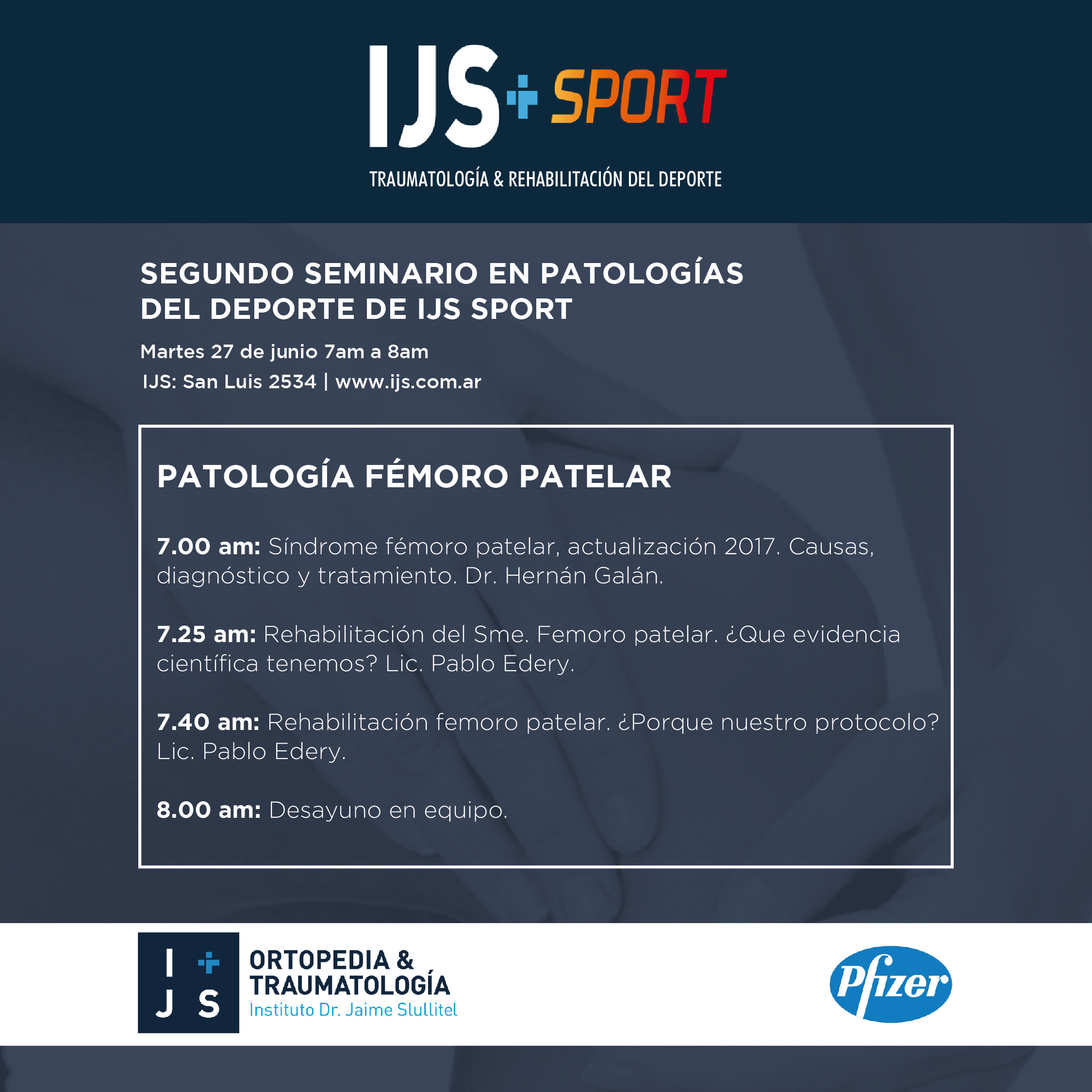 El próximo martes 27 de junio a las 7am se realizará el 2do. seminario de patología del deporte de IJS Sport. El doctor Galan y el Lic. Pablo Edery presentarán las últimas novedades en el manejo de la patología Fémoro Patelar.